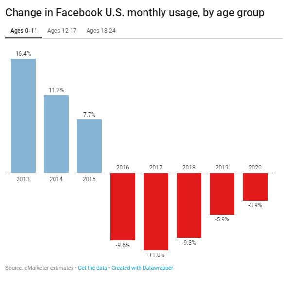 eMarketer’s 2017 forecast stated that for the first time ever, Facebook would see a drop in users. The research firm estimated that there would be a 3.4 percent drop in USÂ users aged 12 to 17 years old. However, the reality turned out to be much worse, as that young demographic actually saw a 9.9 percent decline in users. That’s about 1.4 million people.