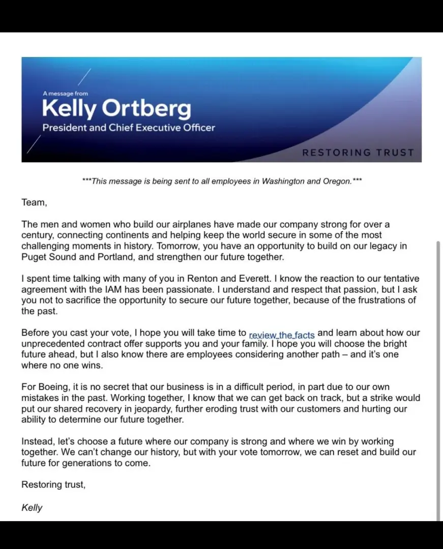 Ortberg, who took over as CEO in August, is tasked with turning Boeing’s fortunes around. In a last-ditch plea to workers, he warned that a strike would jeopardize the company’s recovery. “We are in a difficult period, in part due to our own mistakes, but a strike would further erode trust with our customers and harm our ability to shape our future together,” he said.