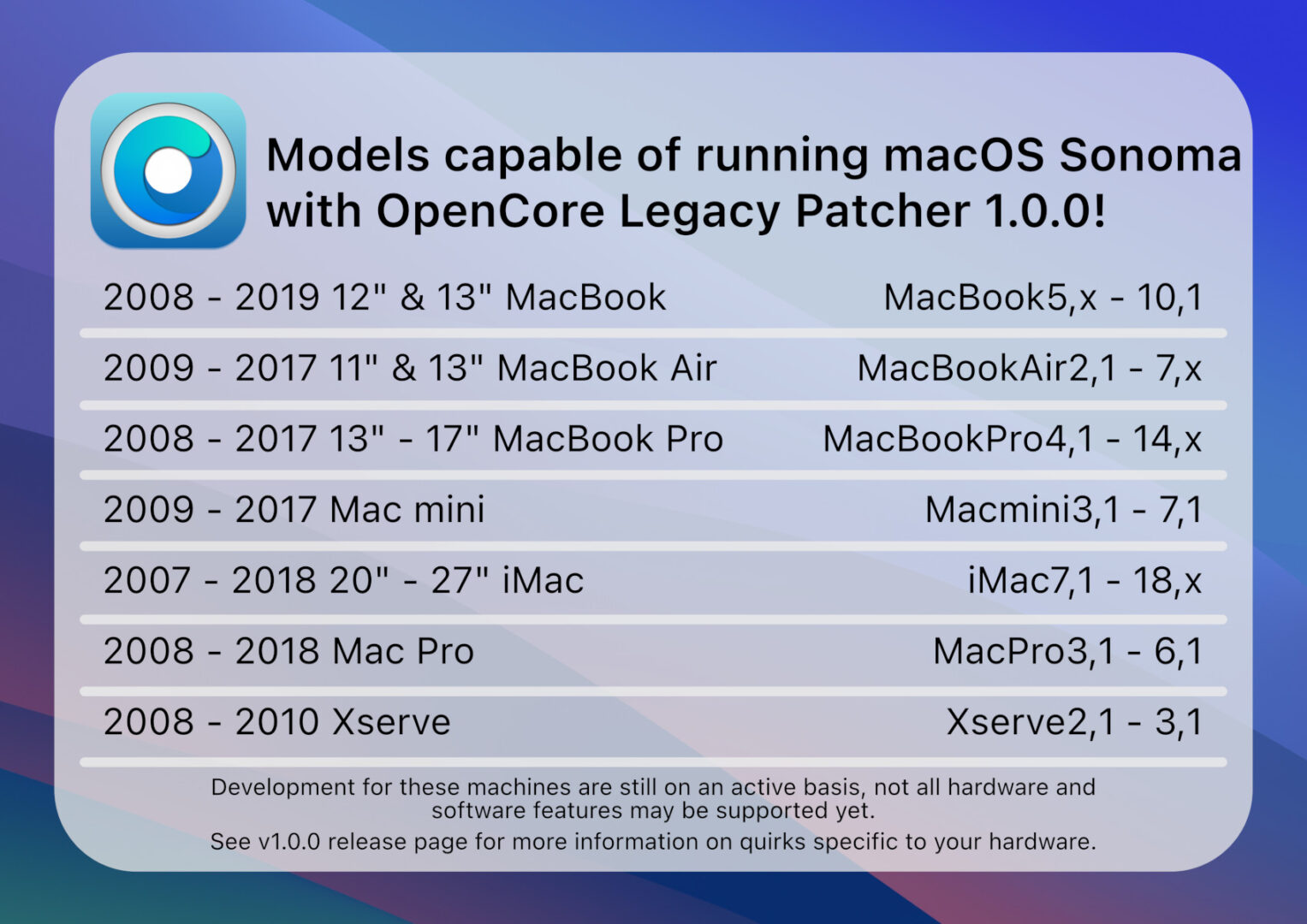 With the release of OpenCore Legacy Patcher 1.0.0, we’re proud to announce macOS Sonoma support! And with it, 83 unsupported Mac models will be able to run Apple’s latest OS!