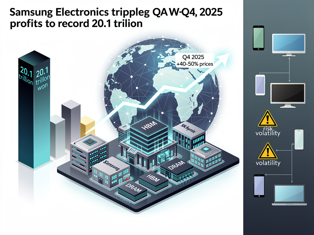 Samsung Electronics Co. unveiled staggering fourth-quarter results for 2025, with operating profit soaring more than threefold to a record 20.1 trillion Korean won ($14 billion), eclipsing analyst forecasts and the company’s own guidance. Revenue climbed 24% year-over-year to 93.8 trillion won ($65.58 billion), marking a fresh quarterly high. This windfall stems from explosive demand for high-bandwidth memory chips powering AI data centers, which has triggered widespread shortages and skyrocketed prices across memory types.